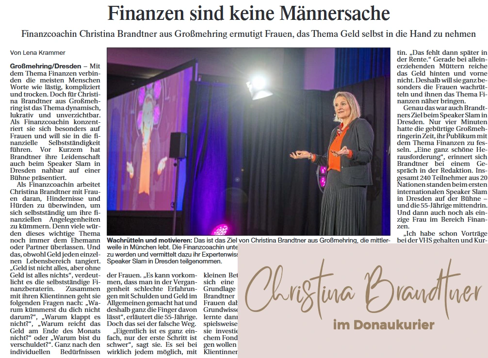 Christina Brandtner setzt sich dafür ein, dass Frauen ihre Finanzen selbst in die Hand nehmen – denn finanzielle Unabhängigkeit bedeutet Sicherheit. Ob Wohnung, Kleidung oder die Zukunft der Kinder – Geld spielt in allen Lebensbereichen eine zentrale Rolle. Doch keine Sorge: Finanzwissen ist keine Geheimwissenschaft, sondern etwas, das jeder lernen kann.